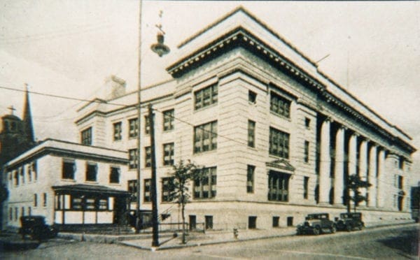 Old cars sit out front of this old school building.