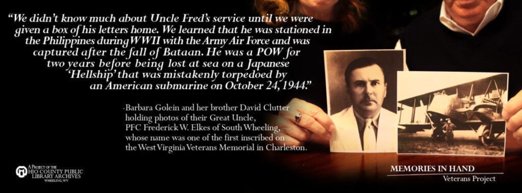 For his honorable service and sacrifice, Frederick Elkes, the South Wheeling boy, was posthumously awarded the Purple Heart. His name is inscribed on the Tablets of the Missing at the Manila American Cemetery in Manila, Philippines. And the name Frederick William Elkes was one of the first inscribed on the West Virginia Veterans Memorial in Charleston.