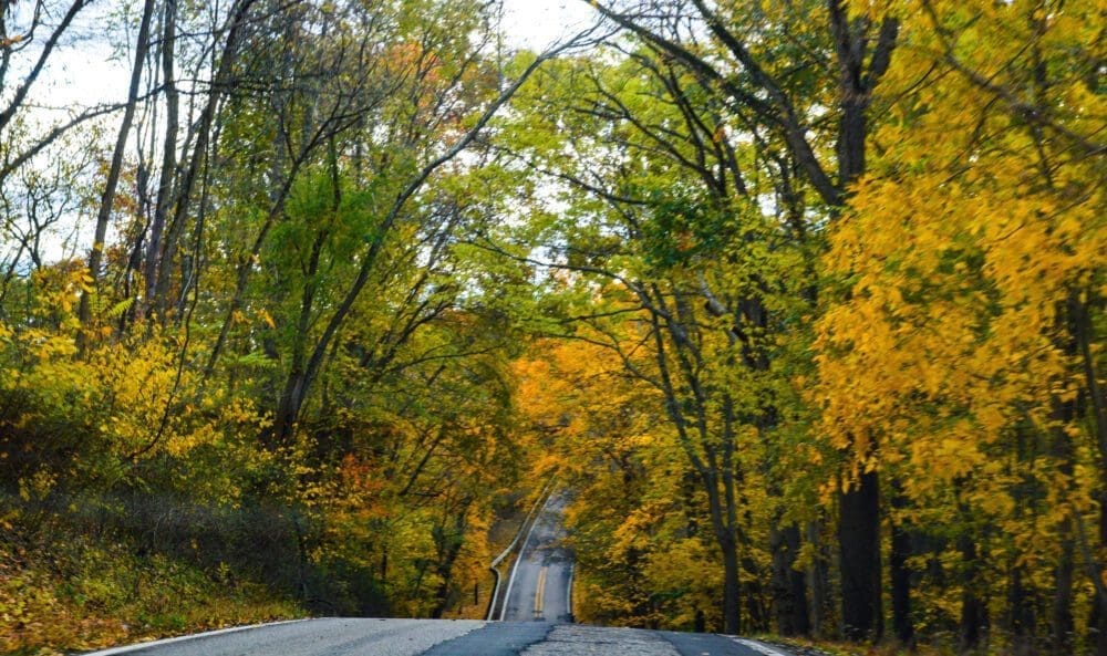 Gold, green, and red are the prominent colors in this photo of the Fall season.