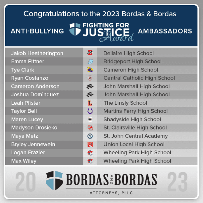 Bordas & Bordas is proud to announce the names of the 14 students from schools in Ohio, Marshall and Belmont counties who are recipients of the Bordas & Bordas Anti-Bullying Fighting for Justice Award.