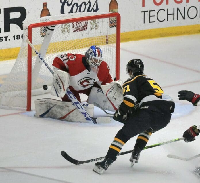 Cincinnati’s power play had a big impact on the middle frame, as it converted on back-to-back opportunities. Jimmy Soper recorded the first go-ahead goal, as he deflected in a perfect pass on the left side of the crease from Noah Kane. Jalen Smereck was responsible for the second man advantage marker, as he wired a wrist shot off the crossbar and in from the left point. Those two strikes were sandwiched around Jordan Martel’s 30th goal of the year, as he rushed down the left side of the ice and shoveled a backhander over Talyn Boyko’s right shoulder.