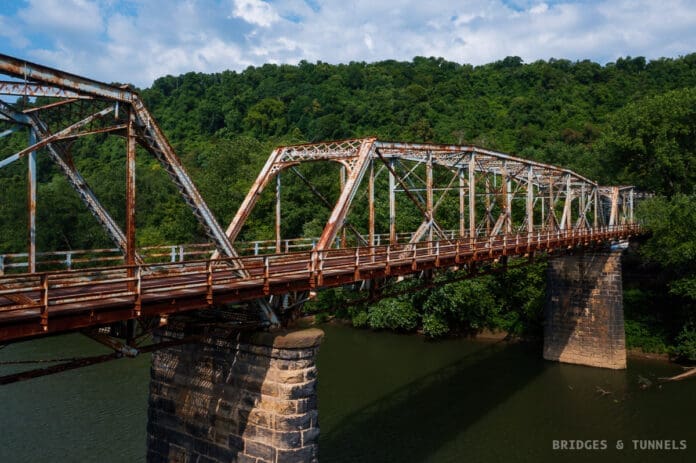 The Aetnaville Bridge is a “Pennsylvania Through Truss” span that measures 1,043 feet. The roadway is 18 feet wide, and the piers are made of locally sourced sandstone. Initially used for interurbans, or streetcars, but was converted into a toll bridge for automobiles.