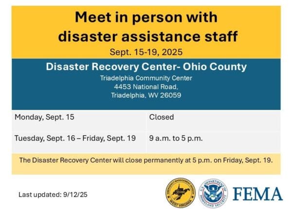 CHARLESTON, W.Va. – The Disaster Recovery Center at the Triadelphia Community Center will be closed on Monday, Sept. 15. It will reopen at 9 a.m., Tuesday, Sept. 16.