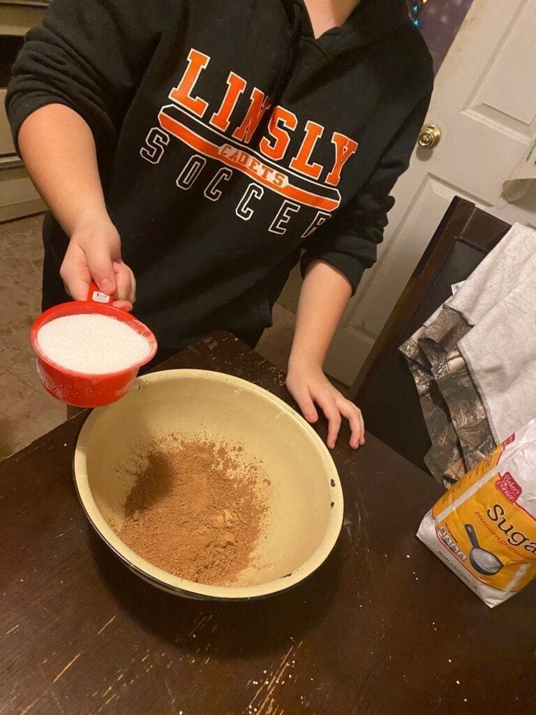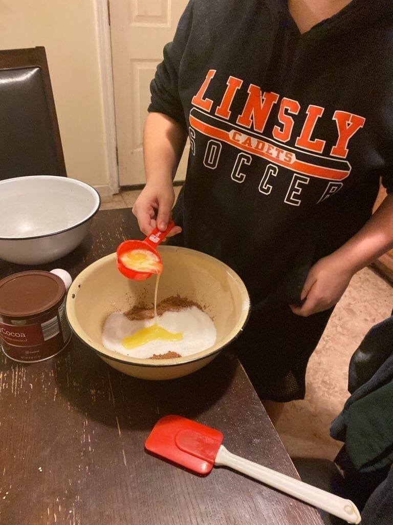 Grab your two mixing bowls ahead of time; one for wet ingredients, the other for dry. Combine the cocoa powder, granulated sugar and butter into one bowl. Add the melted butter last and then mix together.