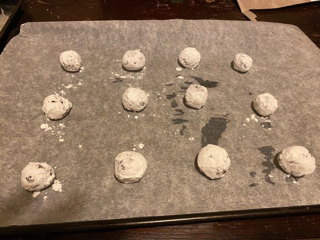 After you’ve waited, preheat your over to 350 degrees and prepare a number of cookie sheets lined with parchment paper.