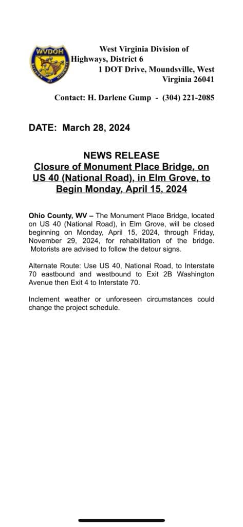 The Monument Place Bridge, located on US 40 (National Road), in Elm Grove, will be closed beginning on Monday, April 15, 2024, through Friday, November 29, 2024, for rehabilitation of the bridge.