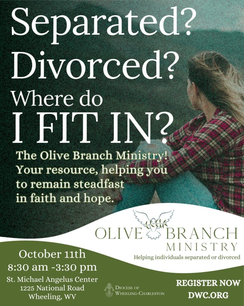 Barton is the director of the Social Ministries Office in the Diocese of Wheeling-Charleston, and she’s organized the Olive Branch program’s first event this Saturday from 8:30 a.m.-3:30 p.m. at the St. Michael’s Angelus Center on National Road. The Olive Branch offers information and resources “to aid in achieving personal and spiritual growth while navigating the complicated and painful process of separation or divorce”.
