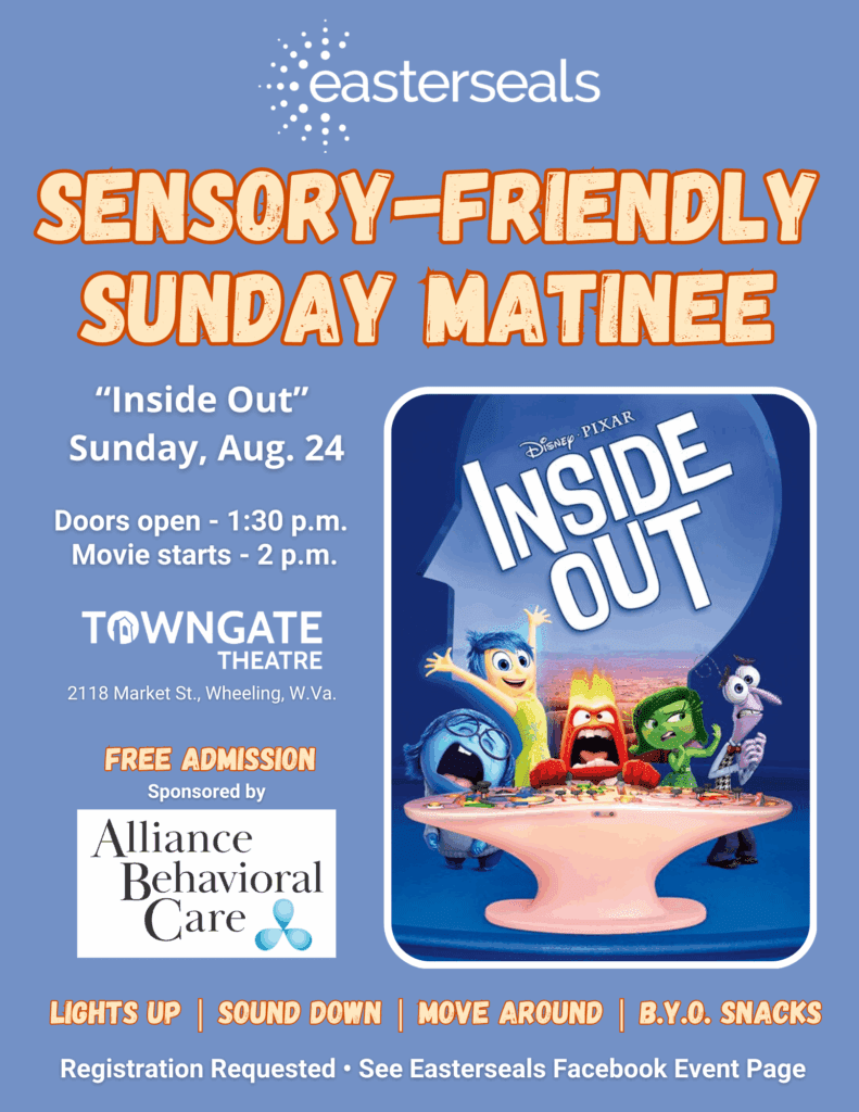 WHEELING — Easterseals Rehabilitation Center is teaming with Oglebay Institute’s Towngate Theatre to present the venue’s second Sensory-Friendly Sunday Matinee, featuring the 2015 Disney Pixar film, “Inside Out,” at 2 p.m. Sunday, Aug. 24.
