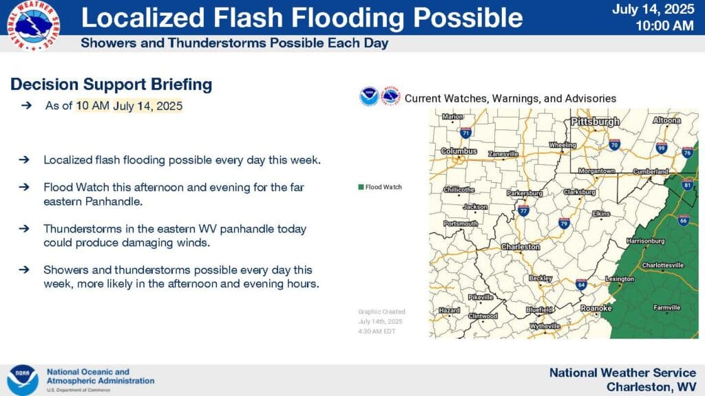 Monday, July 14th, 2025, Statewide Emergency Management Weather Briefing with all of the National Weather Service offices that serve West Virginia…potential again today for heavy rain & slow-moving weather systems that may result in flash flooding…stay alert for severe weather alerts.