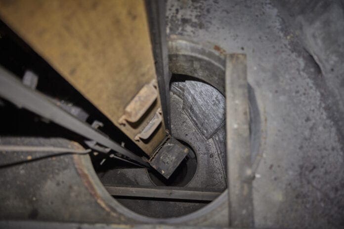 The belt traveled from the first to fifth floors and back, and it was manufactured using a cotton canvas. The belt had handles and platforms attached to lift and drop employees working inside the 12th Street Garage in downtown Wheeling, and they would rise and fall through circular and oblong openings which were carved through the concrete floors.