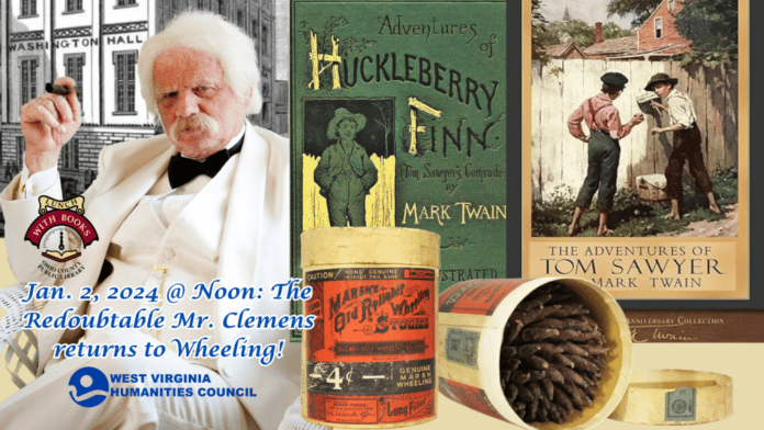 Mark Twain was the pen name of Samuel Clemens. He visited Wheeling on Jan. 10, 1872, speaking at Washington Hall. His favorite cigar was the Marsh Wheeling toby. Twain is portrayed by Doug Riley, sponsored by West Virginia Humanities Council History Alive!