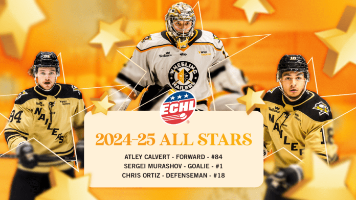The ECHL has announced the rosters for the 2024-25 Midseason All-Star Team, and three members of the Wheeling Nailers have been selected for the Eastern Conference. Wheeling’s representatives are goaltender Sergei Murashov, defenseman Chris Ortiz, and forward Atley Calvert.