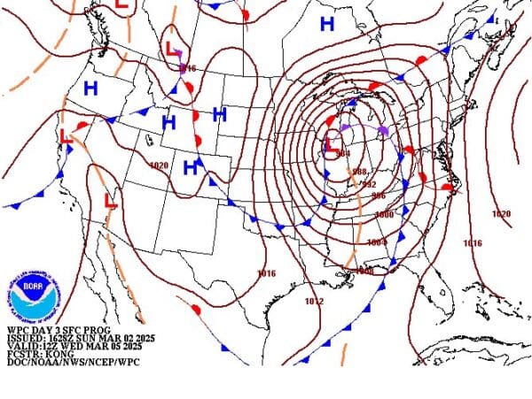 The map is for Wednesday morning and it shows a strong Low Pressure system crossing over the Ohio Valley.