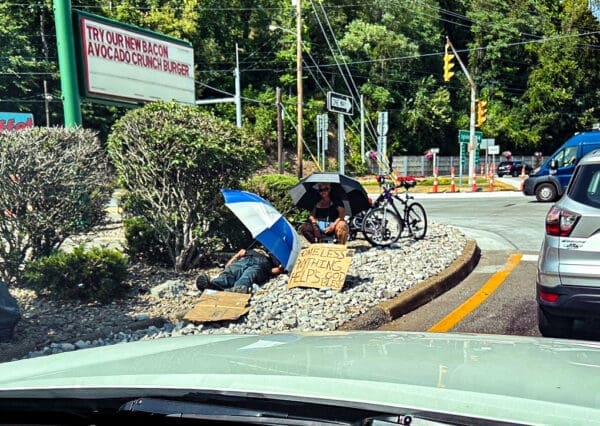 This is sad, first and foremost, because the pictured individuals feel as if this is the best way to survive for another day. This is sad because of how extremely unsafe this is for these individuals not only because of the threat of injury from a distracted or drugged driver swerving off the exit ramp, but because of their exposure to vehicle exhaust and this summer’s heat.