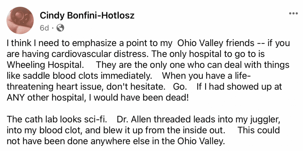 “I just saw a phenomenon later I will consider ‘angels’. They were all around me. The first time I saw the doctor, they were all around him. He held up one finger, like ‘wait’ and I gave him a smile and thumbs up,” she said. “Dr. Christopher Allen saved my life. He had joined the WVU Wheeling team on October 2. Had I not had that doctor at that moment, I would be one of the numbers. I had a cardiovascular event. Dr. Allen used a technology called EKOS to insert leads into one of my jugular veins. I was awake for the procedure. I heard in their voices the relief when it was over.