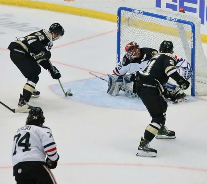 The second period was a different story, as Wheeling rallied back to tie the contest in thrilling fashion. The home team got on the scoreboard at the 8:24 mark, when Félix Paré delivered a perfect pass across the slot to Tyler Drevitch, who slammed in a one-timer from the left side. Then, with the seconds ticking away, Nick Hutchison put what appeared to be one final shot on goal. However, Patrick Watling gloved down the rebound, and tucked in a backhand wraparound to beat the buzzer, as the clock read, “0.2.”