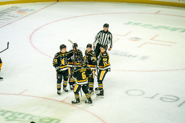 The first period was a busy one, as there was a Maine goal, a pair of double minors for roughing, an ejection, and some wild exchanges of power play time. The Mariners got their goal at the 7:08 mark. Jacob Perreault rang a shot from the right side off of Jaxon Castor’s mask. The rebound dropped into the slot, where it was swatted in by Brooklyn Kalmikov. 50 seconds later, the gloves hit the ice, as Wheeling’s Zach Gallant delivered a solid left in an altercation with Jaxon Bellamy.