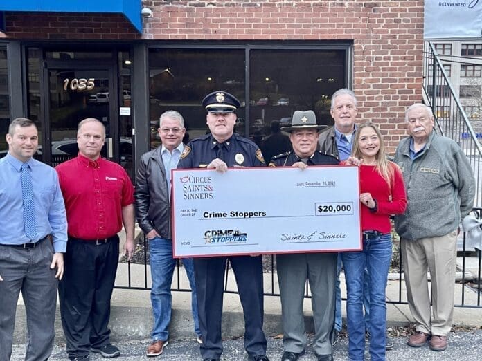 The Circus Saints and Sinners recently presented a check for $20,000 to Crime Stoppers Upper Ohio Valley, a program of Information Helpline. The funds were raised from the club’s annual reverse raffle which was sponsored by Panhandle Cleaning and Restoration and the Mountaineer Brewfest.
