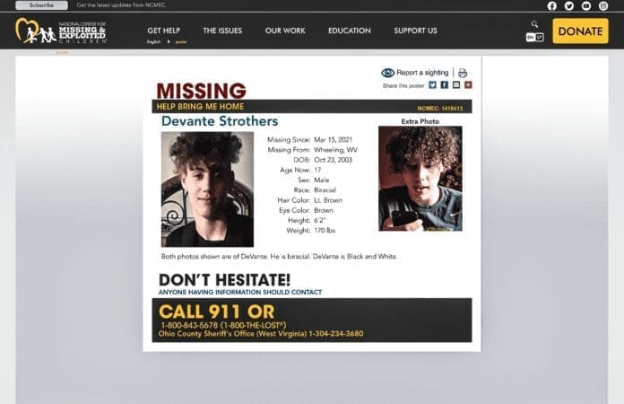 According to the report released by the sheriff’s office on July 6, Strothers is a biracial male with brown eyes, light brown hair and is 6-2 and weighs 170 pounds. If anyone has any information about the teenager’s whereabouts, Chief Deputy John Schultz requests a call to 1-800-843-5678, or to Sheriff’s Dispatch at 304-234-3606.