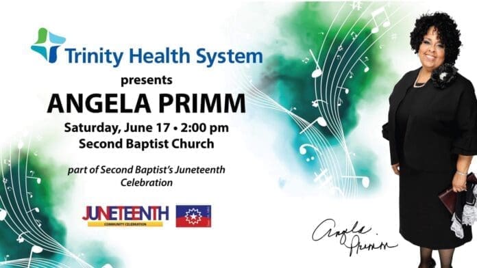 Trinity Health System is proud to have Angela Primm in town for this year’s Juneteenth Celebration. We would like to invite the media to attend the 2 p.m. concert at Second Baptist Church. Angela and Market Director Laurie Labishak will be on hand for interviews.