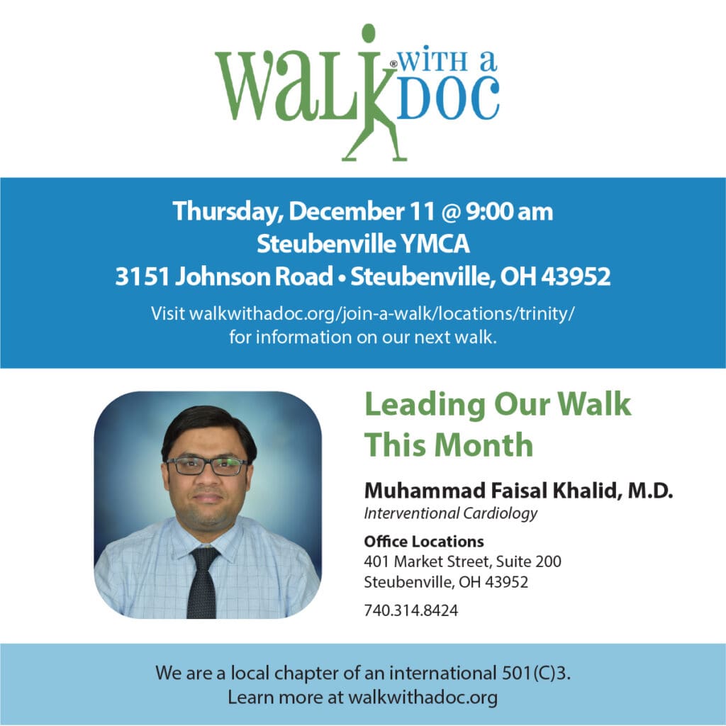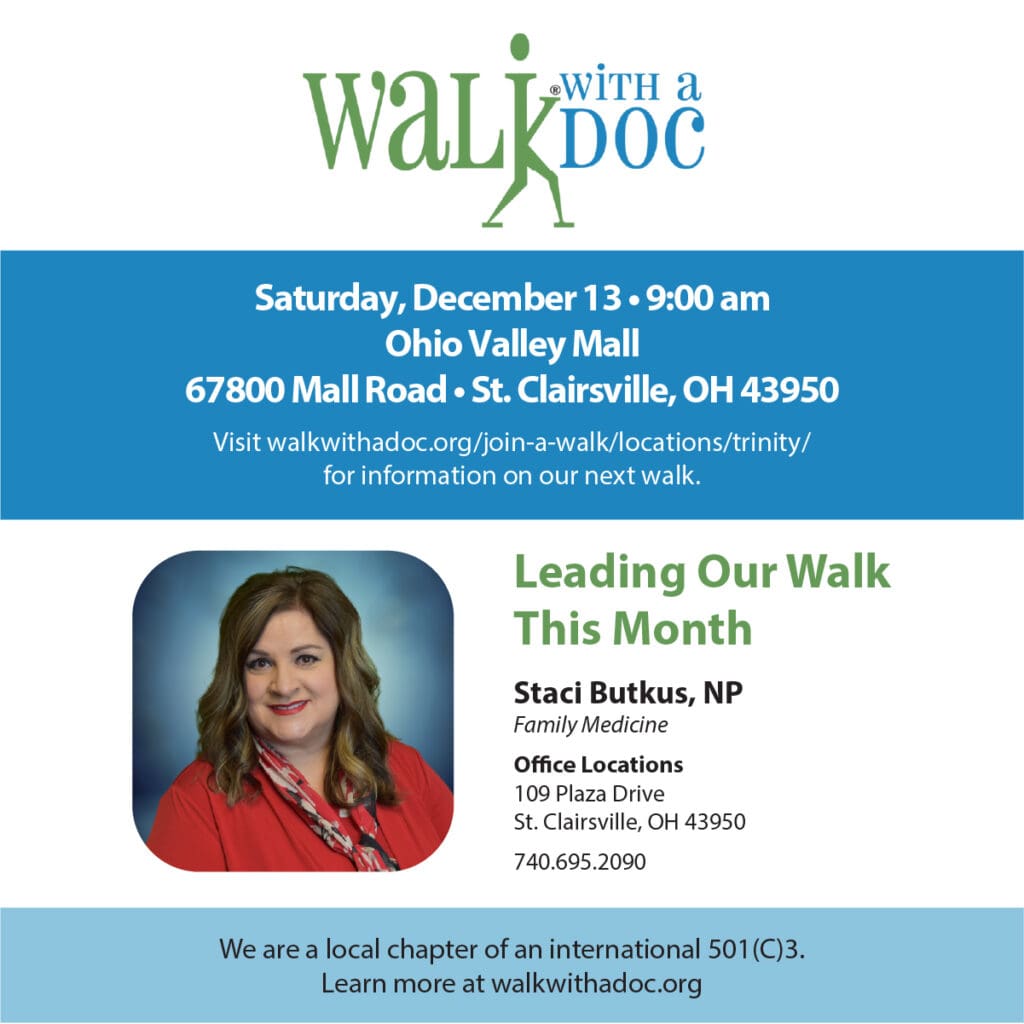 The main entrance of Trinity's Medical Center East in Steubenville, Ohio. Events ‘Walks with a Doc’ Set in Steubenville, St. Clairsville by Trinity Health System By Provided - December 9, 2025 0 FacebookTwitterPinterestWhatsApp Trinity Health System has scheduled its December “Walks with a Doc”. In Steubenville, the gathering will take place this Thursday, December 11, and walkers will meet in St. Clairsville this Saturday, December 13. TagsbelmontcountyStClairsvillesteubenvilleTrinityTrinityHealthTrinityHealthSystemUpperOhioValleyWalkWithADoc FacebookTwitterPinterestWhatsApp Previous articleMaxim Pavlenko Named ECHL Goaltender of the WeekNext articleW.Va. Legislature’s Broadband Strategy Delivers Internet Expansion Provided LATEST POSTS Events 7th Ann Thomas Memorial Lecture Will Feature Shark Scientist Jasmin Graham Jasmin is a leading figure in marine biology, renowned for her innovative research and passionate advocacy for ocean conservation. January 22, 2026 Events MLK Celebration Includes Several Events in Wheeling There are a number of events taking place today, tomorrow, and Monday. January 17, 2026 Events Today’s OCPL Lunch with Books: The Last Hitman with Robin Yocum Angelo Cipriani was a loyal and trusted member of the Fortunato crime family for more than four decades, and a hitman without peer. But times... January 13, 2026 Events Wheeling’s State of the City Address Slated for Feb. 10 The event was created by former mayor Andy McKenzie. January 10, 2026 Load more