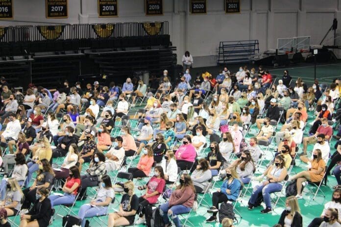 Presided over by President W. Franklin Evans, the convocation took place at noon in the Academic, Sports and Recreation Center (ASRC), a large space that allowed appropriate social distancing. Approximately 400 freshmen attended.
