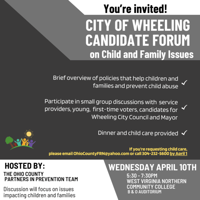 The Ohio County Partners in Prevention Team is set to host a Candidate Forum with those running for Wheeling Mayor and Wheeling City Council. The focus is on child and family issues and will be held April 10th, from 5:30 PM to 7:30 PM at West Virginia Northern Community College.