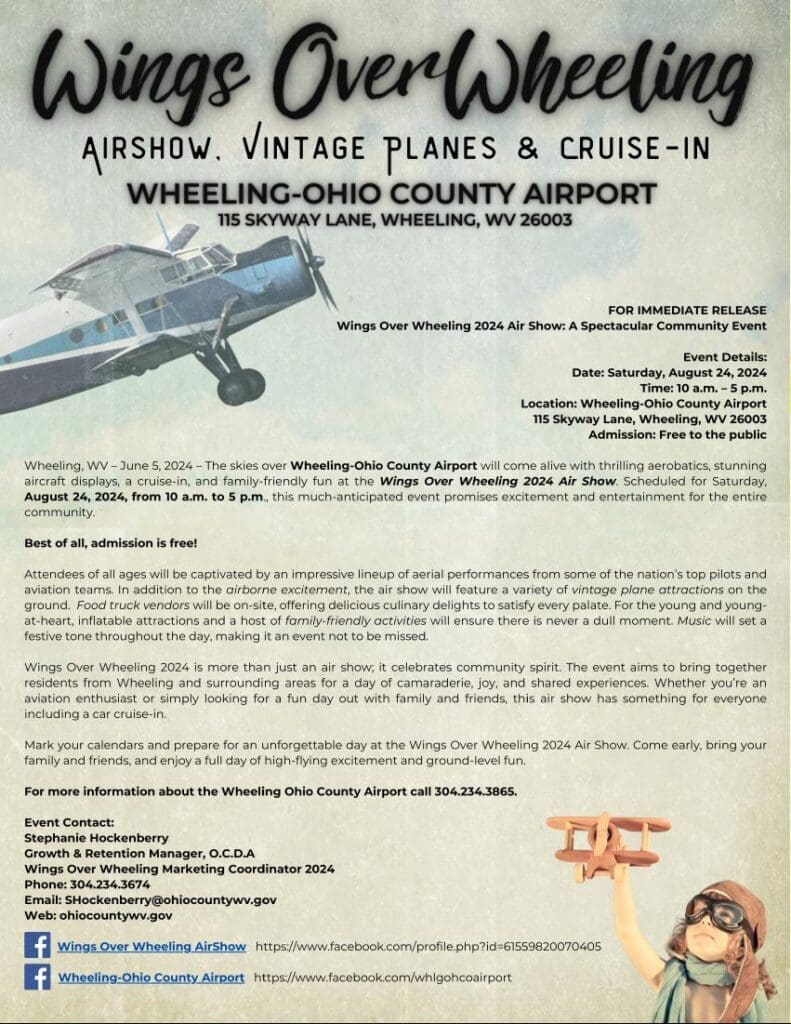 News Wings Over Wheeling Airshow Scheduled for August 24th By Provided - June 5, 2024 0 FacebookTwitterPinterestWhatsApp The Wheeling-Ohio County Airport is officially referred to as "HLG" in aviation circles.