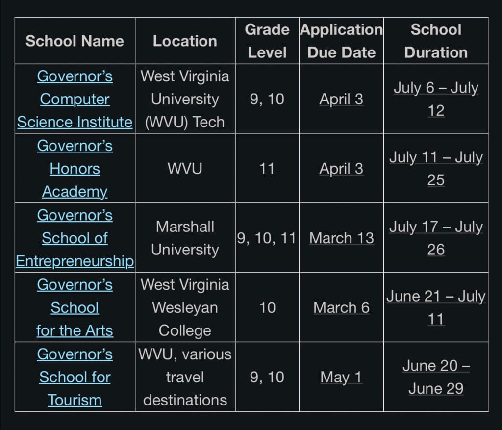 | Charleston, W.Va. — The West Virginia Department of Education (WVDE) is accepting applications for the 2026 Governor’s Schools of West Virginia. This program offers summer residential learning experiences at designated universities for high school students. Founded in 1984, West Virginia Governor’s Schools offer students unique experiential learning opportunities in the humanities and the arts, computer science, business communications, entrepreneurship, leadership and more. In addition to refining talents and workable skills, young scholars develop lifelong personal and professional networks and receive instruction from practicing professionals in their areas of interest. The grade level is the grade the applicant currently holds. Application deadlines are as follows: |